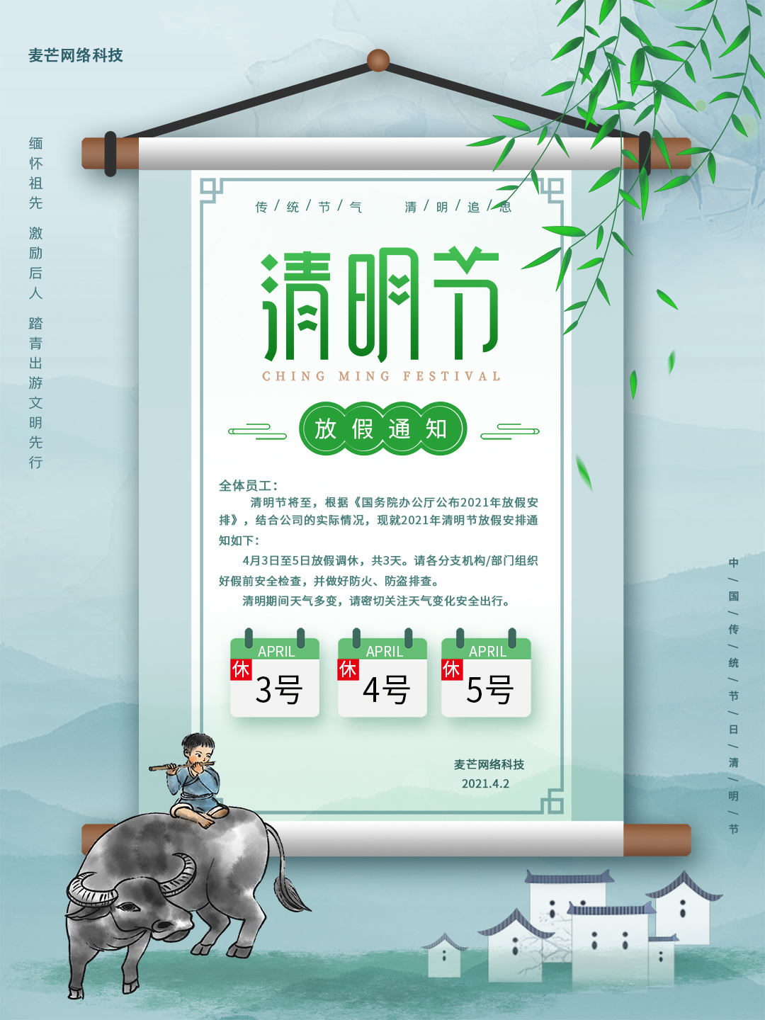 根據(jù)國務院辦公廳通知精神,我司現(xiàn)將2021年清明節(jié)放假安排通知如下: