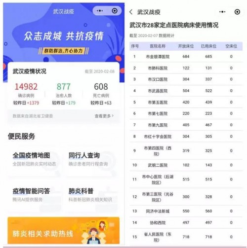 武漢也上線了"武漢戰(zhàn)疫"小程序,可以查詢武漢疫情狀況,以及疫情辟謠、發(fā)熱自查、發(fā)熱門診導(dǎo)航等,同時還能查詢武漢各大醫(yī)院的床位,方便感染者快速住院。