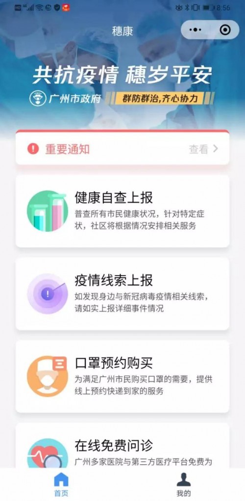 廣州市政府上線了"穗康"小程序,支持重要通知發(fā)布、健康自查上報、疫情線索上報、口罩預(yù)約購買、在線免費(fèi)問診等幾個模塊。