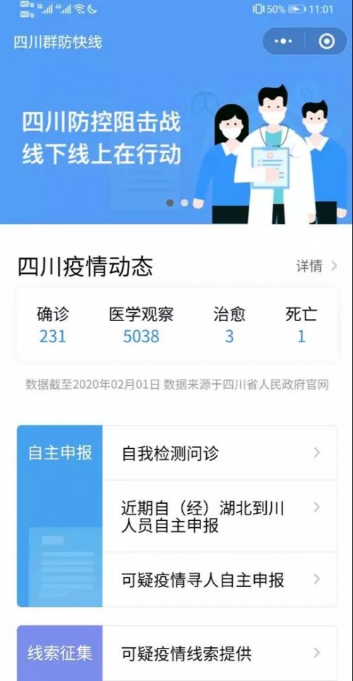 2月3日,四川迅速上線了"四川群防快線平臺",提供個人疫情防控信息自主申報、在線自我檢測、專家視頻問診、可疑疫情線索上報、權(quán)威信息發(fā)布、違反防控規(guī)定行為舉報等在線服務(wù)。